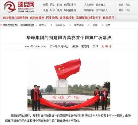 美丽的明心湖畔,五星红旗伴随着雄壮的国歌声高高升起并飘扬在温州大学校园上空……日前,由华峰集团捐建的国内高校首个国旗教育主题广场在温州大学落成。